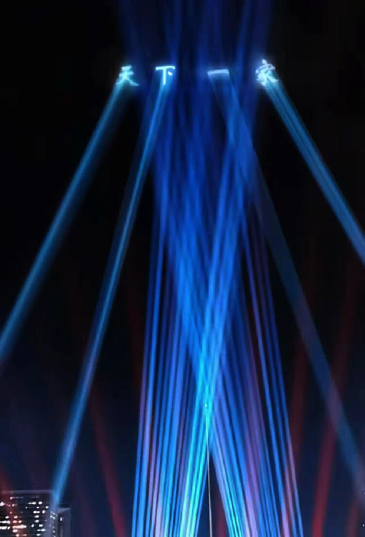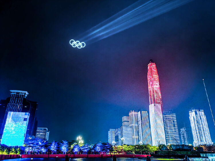 其中,深圳会场展示了“云端写字”的炫技,5盏超高光通量的激光投射灯以云层为纸,以激光为笔,在夜空中书写了“天下一家”四个大字,并在云端投射出奥运五环标志。