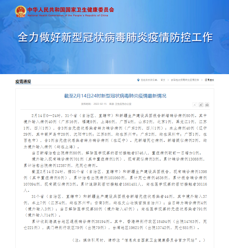 2月14日0—24时,31个省(自治区、直辖市)和新疆生产建设兵团报告新增确诊病例80例。其中境外输入病例40例(广东16例,福建8例,上海6例,广西4例,山东2例,北京1例,黑龙江1例,江苏1例,四川1例),含3例由无症状感染者转为确诊病例(广东2例,四川1例);本土病例40例(辽宁29例,其中葫芦岛市28例、沈阳市1例;江苏8例,均在苏州市;广东2例,均在深圳市;广西1例,在百色市),含1例由无症状感染者转为确诊病例(在辽宁)。无新增死亡病例。新增疑似病例2例,均为境外输入病例(均在上海)。