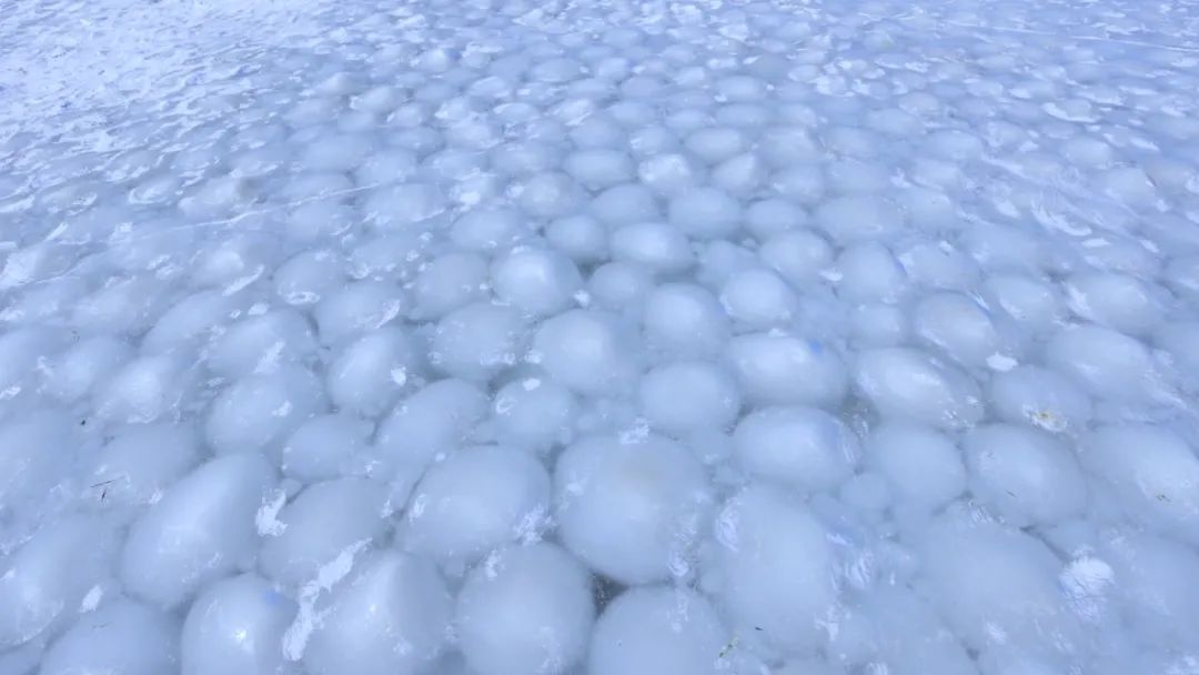 近日,四海湖湿地一个罕见景象被呈现在世人面前,只见湖冰之下一个个冰团聚集在一起,犹如一颗颗大汤圆,这个景观连当地人都前所未见