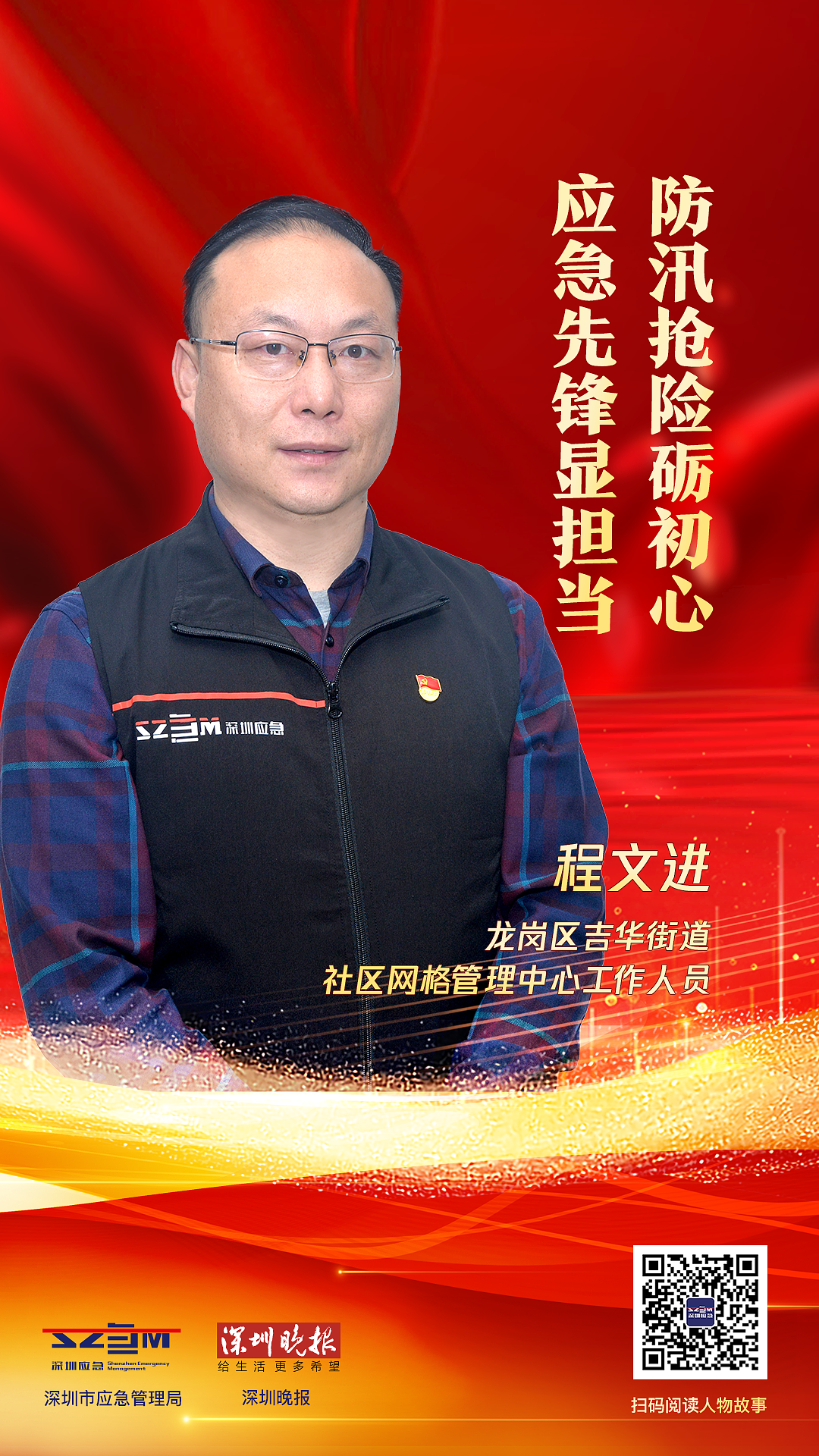 在龙岗区吉华街道,有这样一位应急人,他闻令而动,勇往直前,哪里有需要,哪里就有他的身影——防汛抢险,他是践行“螺丝钉”精神的应急尖兵;防控疫情,他是重点信息核查调度的指战员,他就是吉华街道社区网格管理中心负责人程文进。