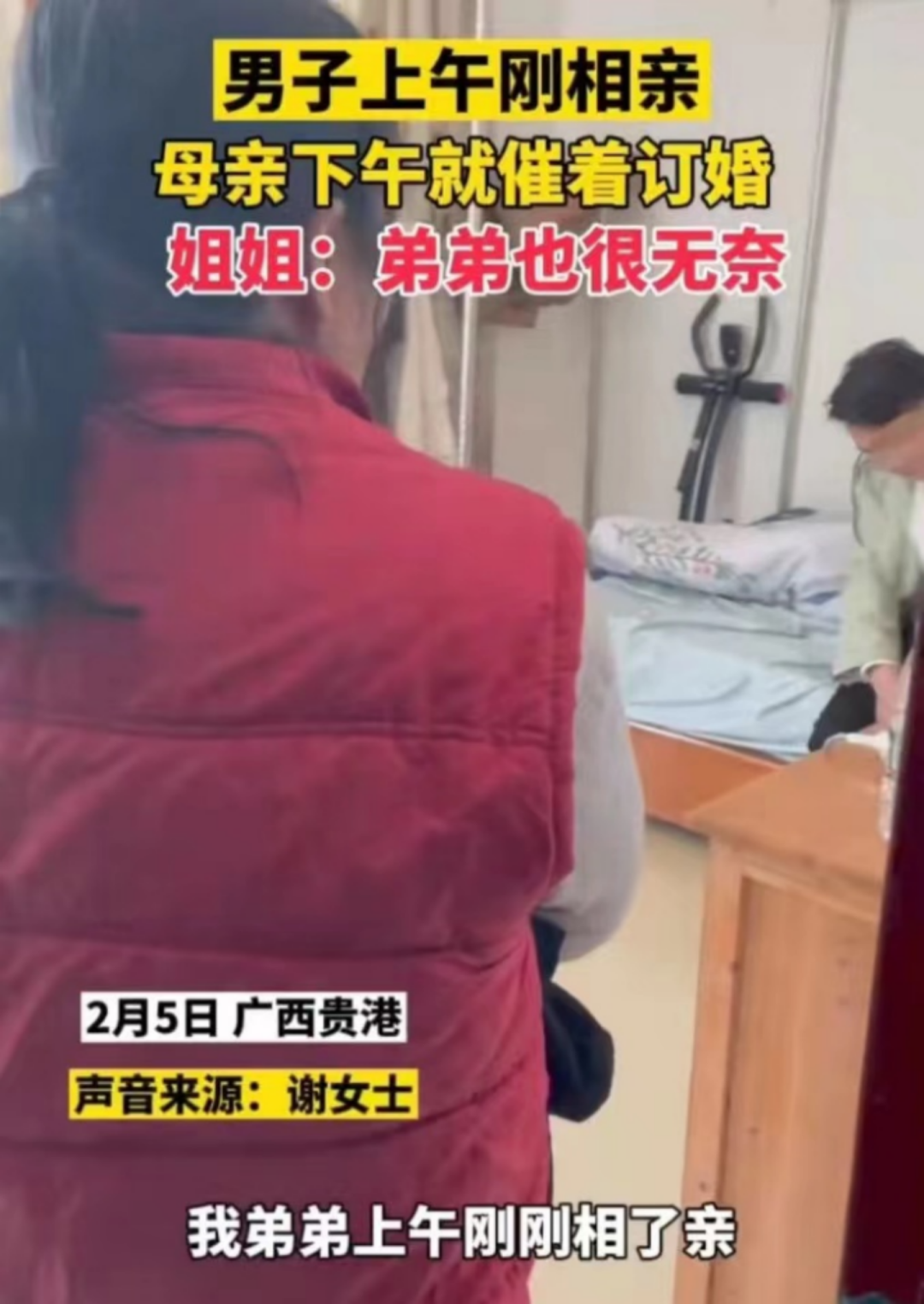 最近,广西壮族自治区贵港市一位母亲催婚的视频引发网友关注。据男孩的姐姐谢女士爆料,男孩被家里安排去相亲,回到家没多久,就被母亲催促订婚:“早上相亲那个女孩合不合适啊?合适的话明天就把亲订了。”