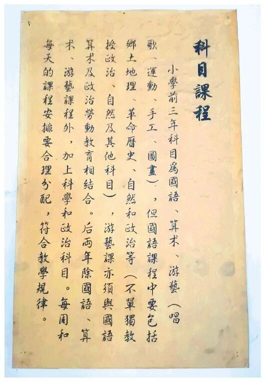 “小学前三年科目为国语、算术、游艺(唱歌、运动、手工、图画),但国语课程中要包括乡土地理、革命历史、自然和政治……每周和每天的课程安排要合理分配,符合教学规律。”走进距离红井不远处的列宁小学旧址,许多到访者看到这份科目课程时不禁惊叹:90年前战火纷飞的年代,中央苏区就开始实行素质教育!