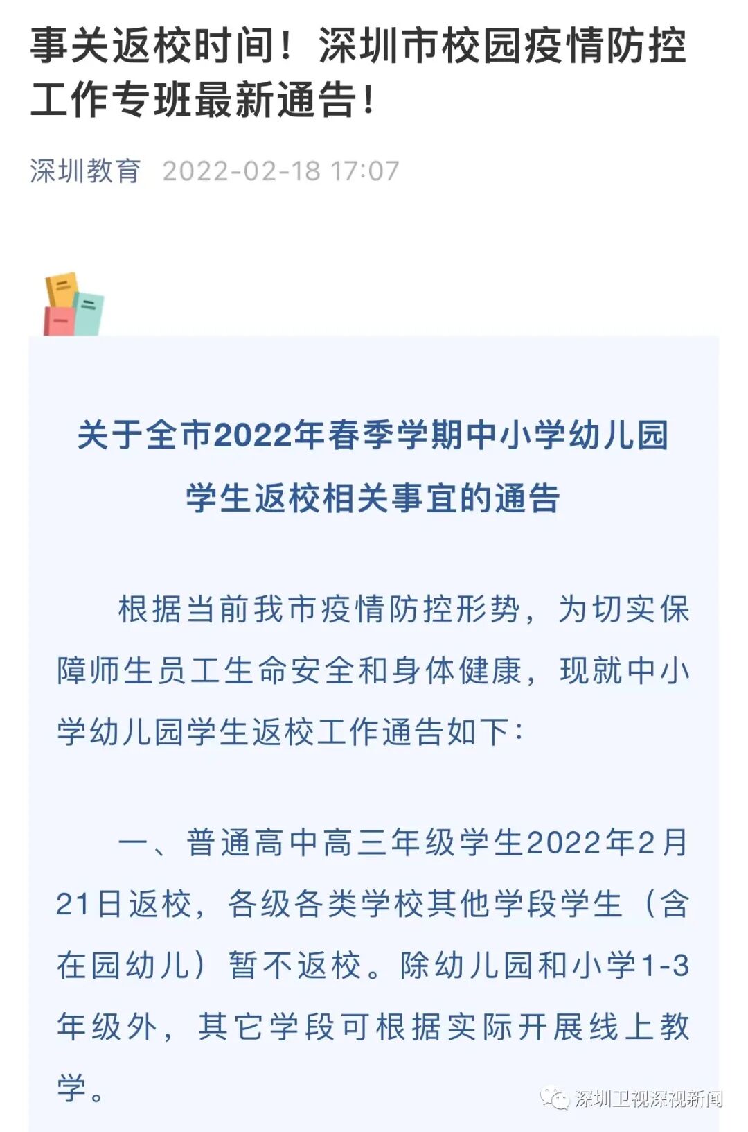 根据当前深圳疫情防控形势,为切实保障师生员工生命安全和身体健康,对中小学幼儿园学生返校时间作出调整。通告明确了普通高中高三年级学生2022年2月21日返校,各级各类学校其他学段学生(含在园幼儿)暂不返校。