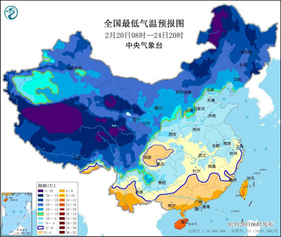 中央气象台2月20日06时继续发布低温蓝色预警:
