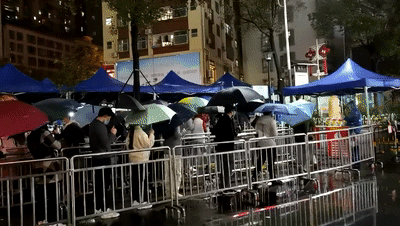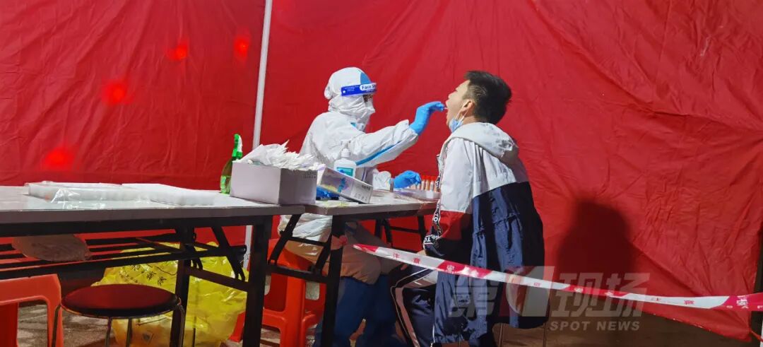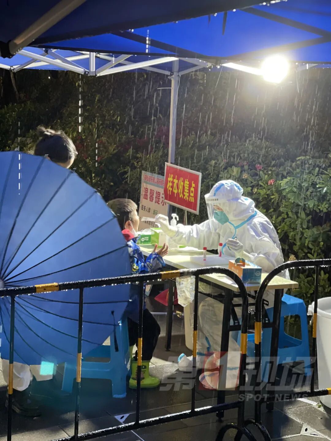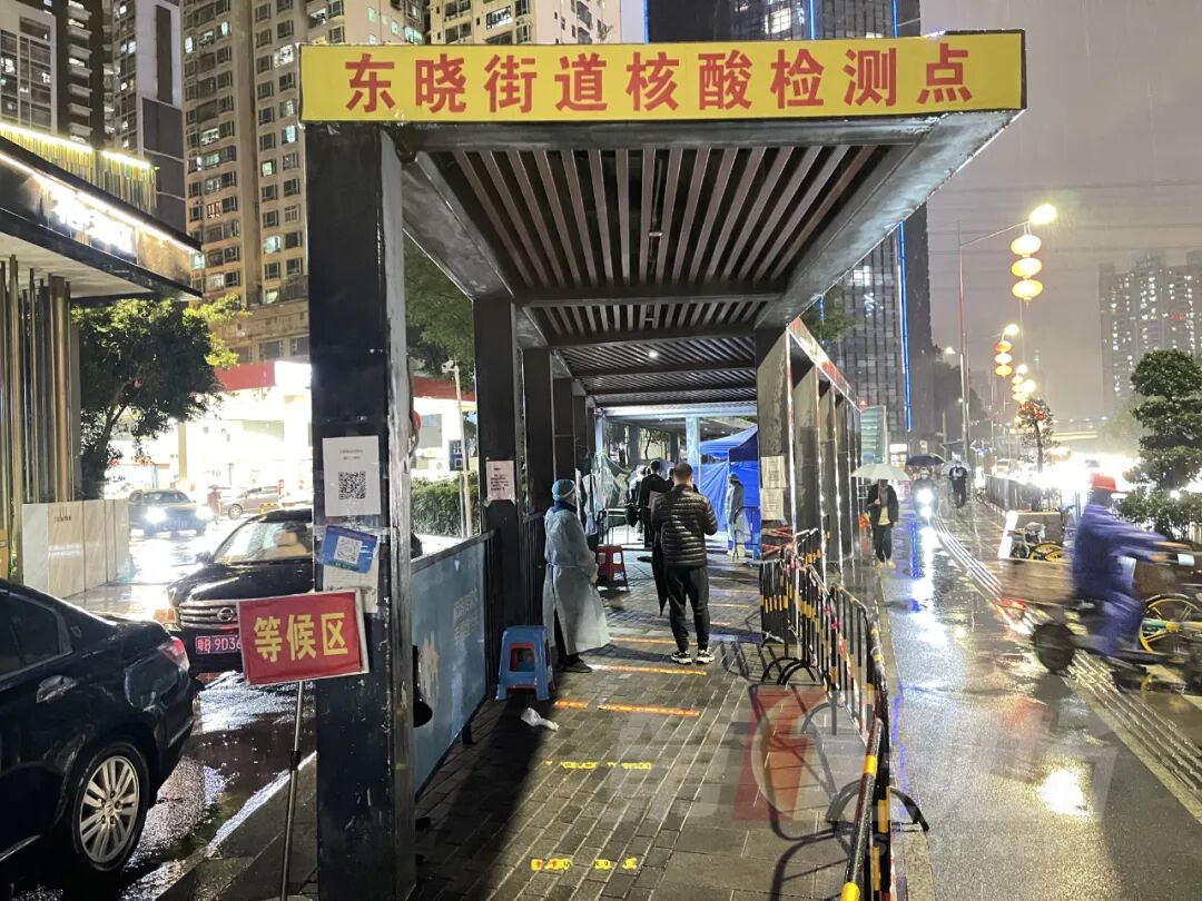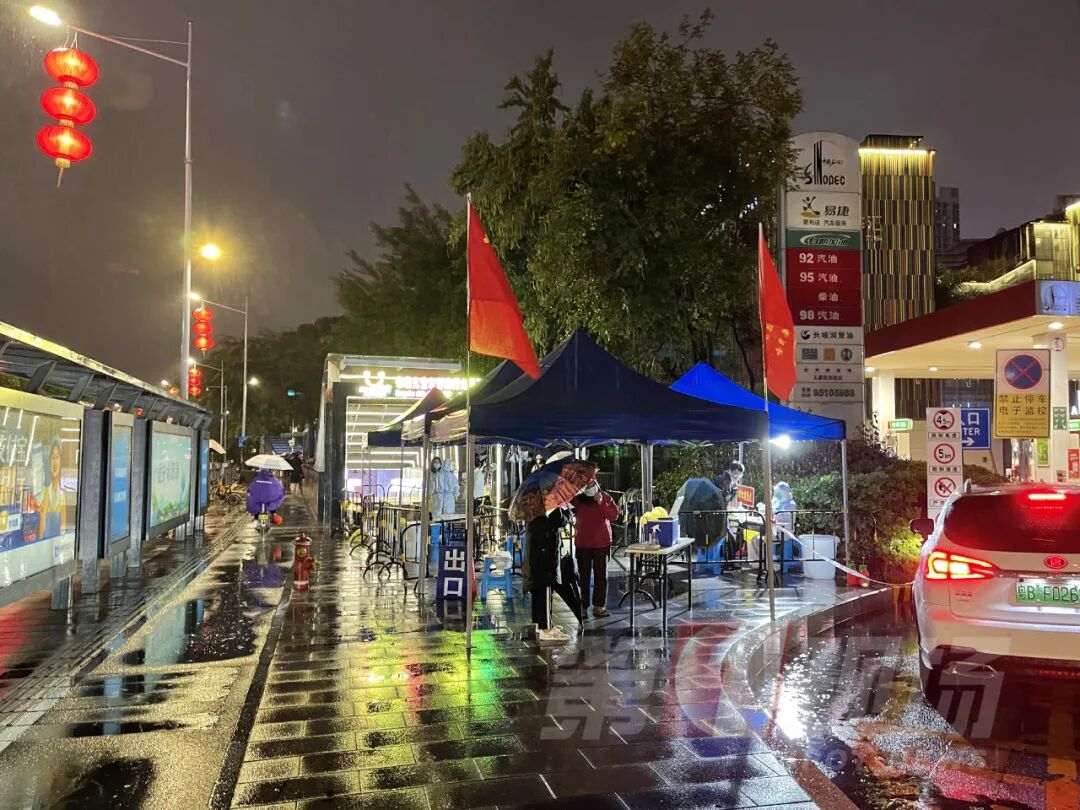 晚上8点,在罗湖区布吉路东晓街道光影地下通道外的核酸检测点,外面一直下着雨,移动帐篷就设置在路边,灯光下,医护人员一一为前来采样的市民服务。