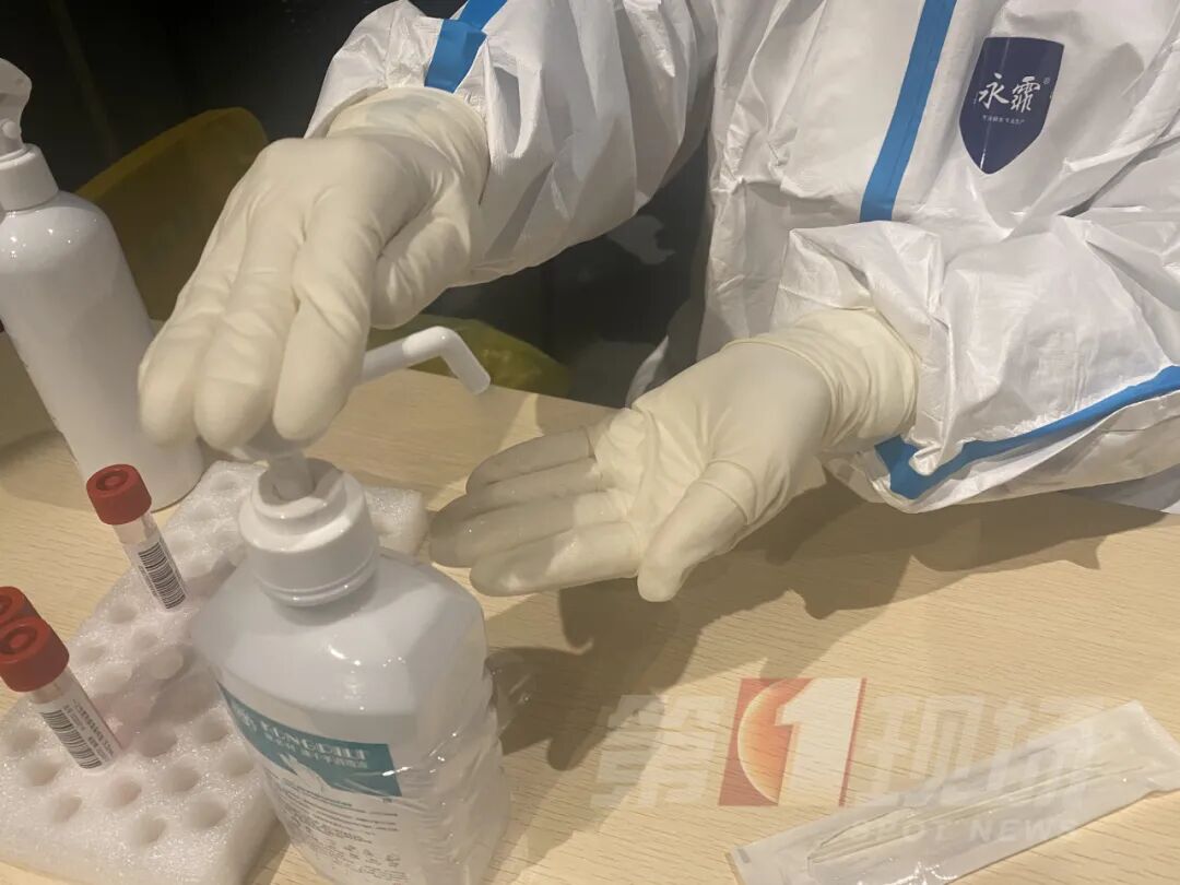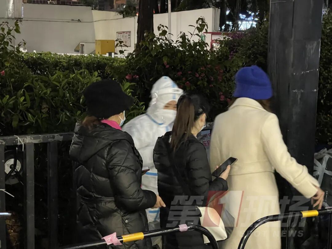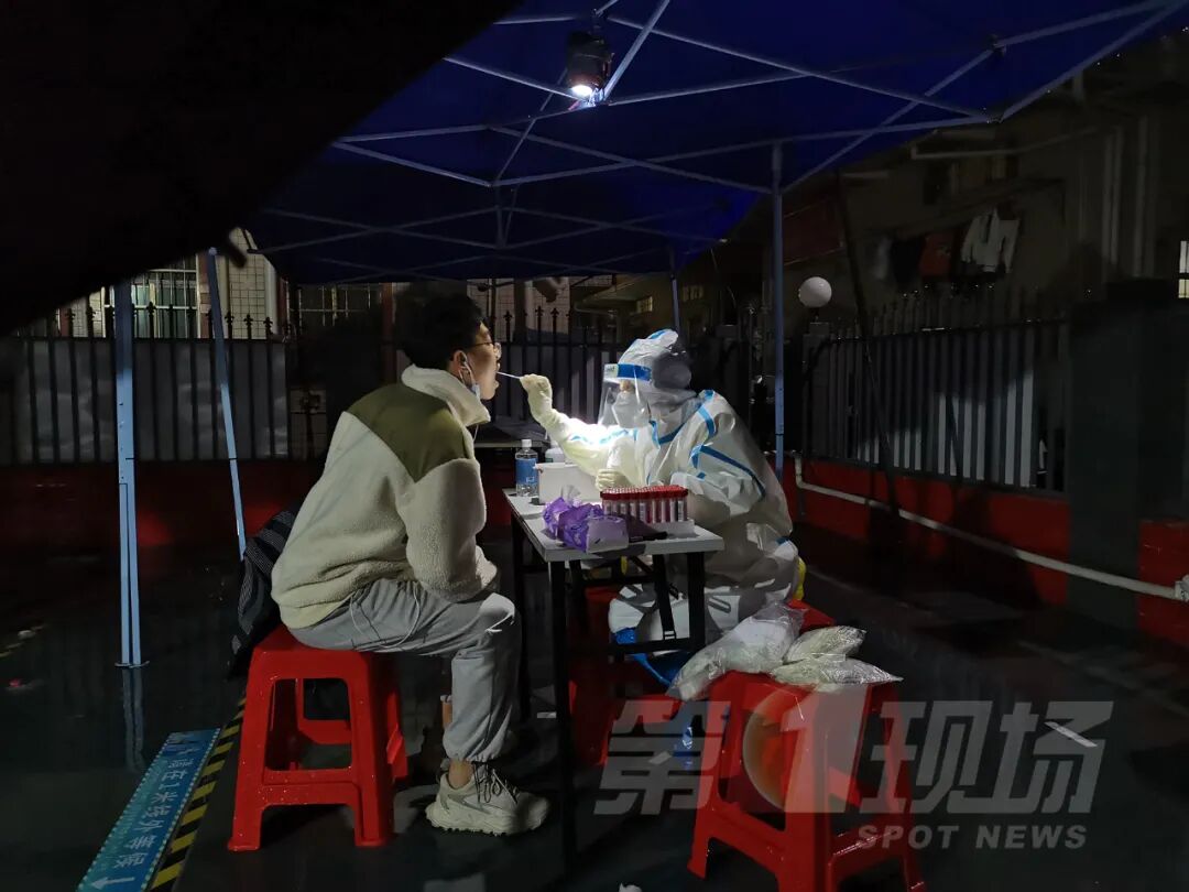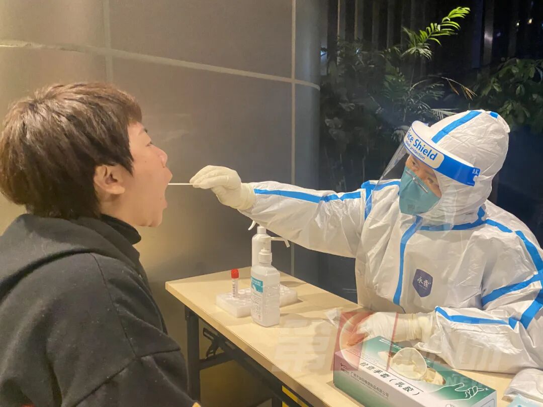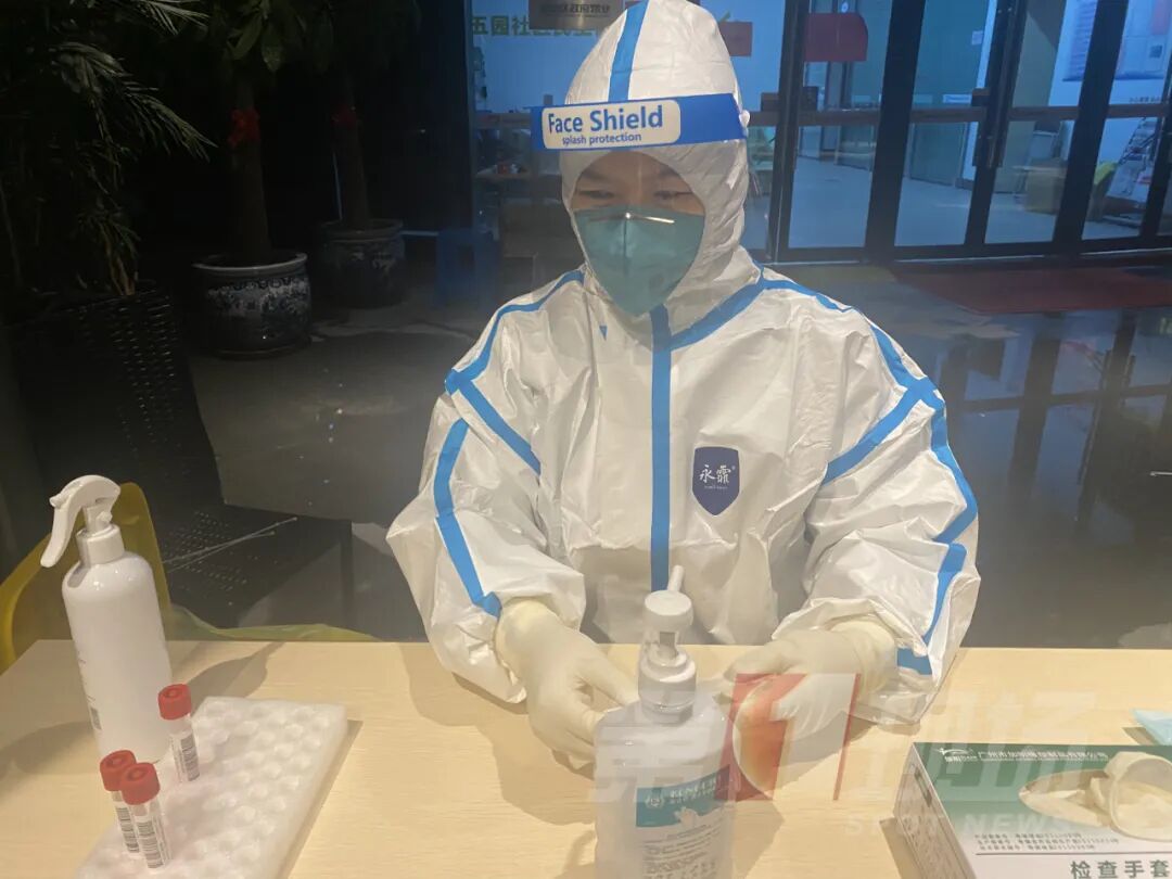 龙岗坂田万科璞悦山小区内,晚上8点,工作人员仍坚守岗位,虽然这里可以避雨,但是穿堂风特别大,居民在现场都冷到手抖,而核酸采样人员每一次检测后,都需要用酒精消毒一遍,湿冷穿透防护手套,医护小姐姐的手早已冻僵,眼神却始终坚定。