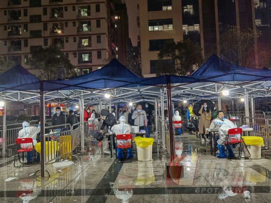 冷雨夜,龙岗坂田五和社区党群广场核酸采样点,医护人员和一线工作人员、义工们仍在继续坚守岗位,前来采样的居民络绎不绝,大家同心抗疫,共同守护家园。