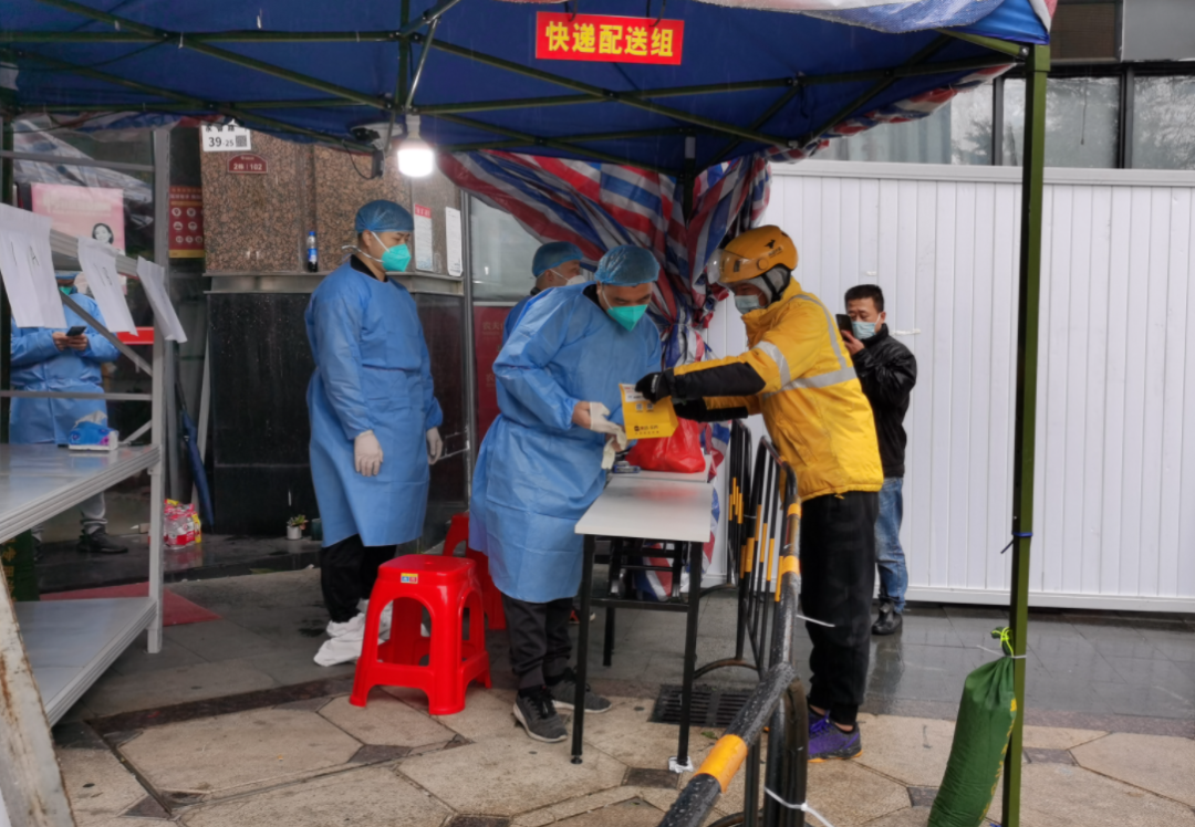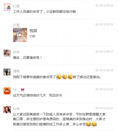 尽管冷风与冰雨交杂,居民的快递抵达诺德公馆门口后,工作人员还是准时送到相应的楼栋下。有居民拿快递时顺便拍下了防控工作的场景,并发在业主群里,激起了一阵暖心的讨论。