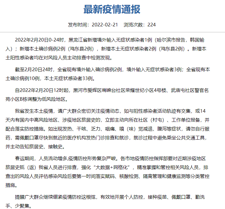 2022年2月20日0-24时,黑龙江省新增境外输入无症状感染者1例(哈尔滨市报告,韩国输入);新增本土确诊病例2例(鸡东县2例),新增本土无症状感染者2例(鸡东县2例)。新增本土阳性感染者均在对风险人员主动排查中检测发现。