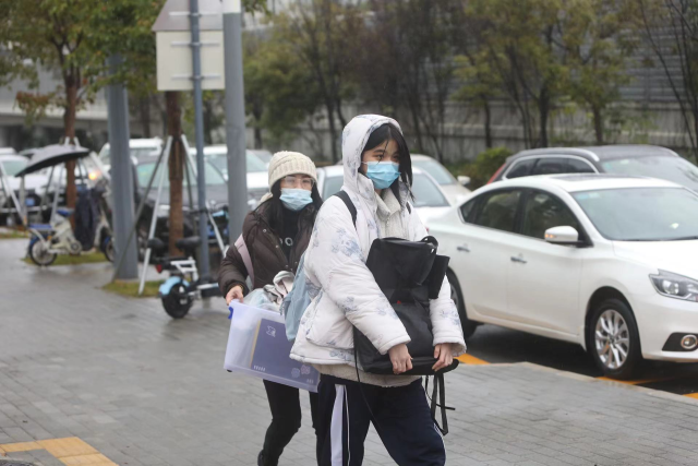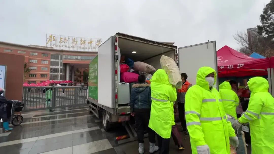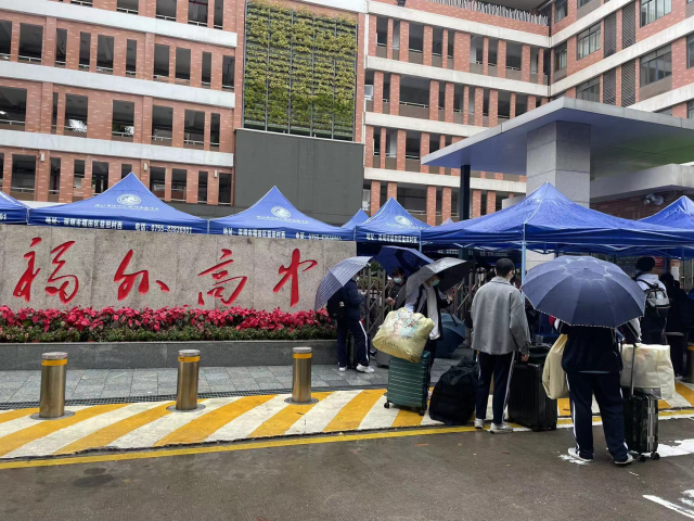 在福田外国语高级中学门口,高中生需要再次排队扫描“粤康码”,不少家长送到校门口,在准备的行李中,厚棉被叠在最上方,寒冷天气让家长更加牵挂学生的身体健康。