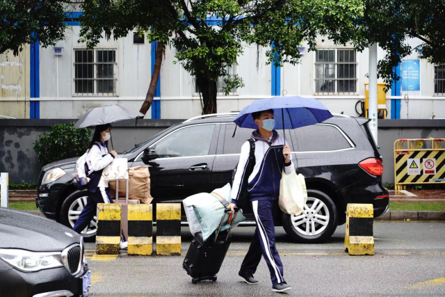 据了解,宝安中学高三预计有1018名同学返校,还有34名同学因为美术集中培训、处于防范区和因病请假等各类情况,暂不返校。返校后,按照市教育局要求,对学生进行全封闭管理,包括学校原来有266名走读生,也全部返校住宿,所以现场很多学生、家长提着生活物资和学习用品返校。