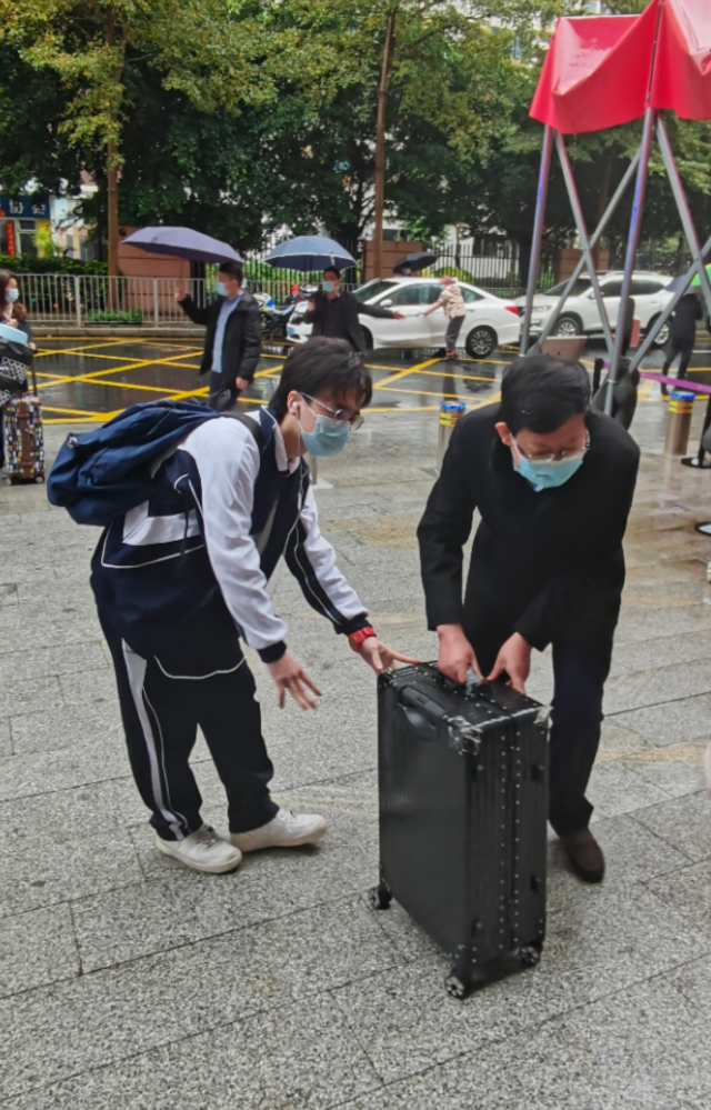 春雨不停,为方便高三学子顺利有序入校,南头中学贴心准备了小推车协助学生搬运行李。