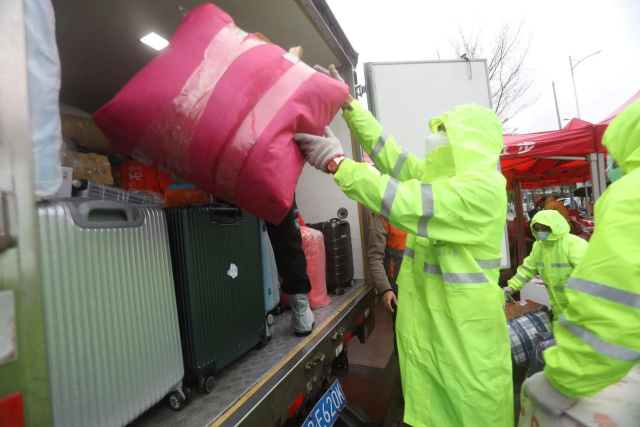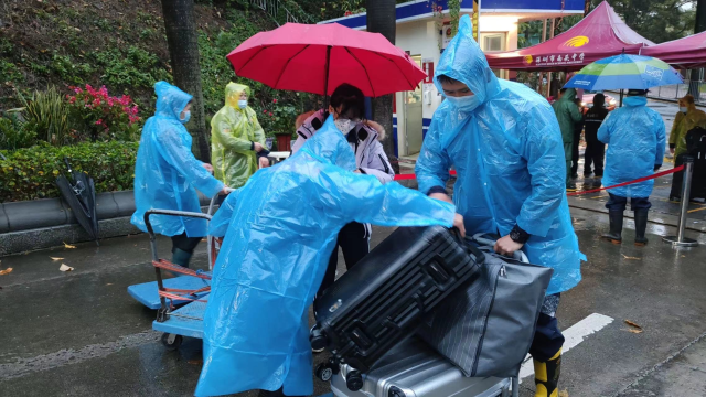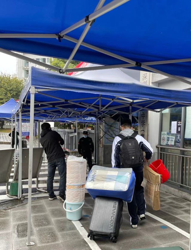 在核查完符合返校要求的学生的24小时核酸、绿码、测量体温后,老师们与学校保安队主动上前,帮学生们搬运大件行李物品。高三年级返校师生施行封闭式管理,老师、学校行政与学生们同吃、同住,共抗疫情。