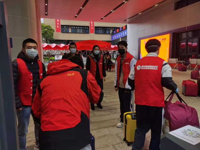 天色阴冷 ,下着小雨,多名身穿红色义工马甲的教师志愿者,在校门口为下车的学生打伞、协助搬运行李、指导扫码,帮助学生快速返校。