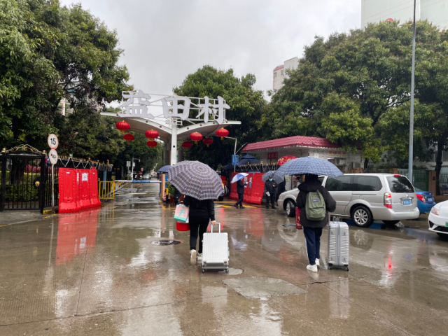 上午8点10分左右,在福田区益田村门口,福田外国语高级中学的高三学生正拖着行李箱进去村内,正式返校。进村需要扫码打卡,出示打卡结果才能进入。