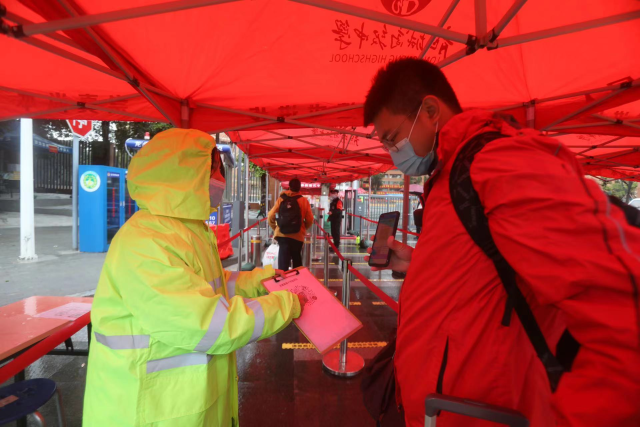 学校安排下午两点正式开始上课,从早上八点开始,就有学生陆续返校,许多家长送学生到校门口,虽然大雨下个不停,但是学生返校热情不减。