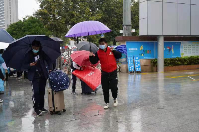 返校高峰期,教师志愿者一趟又一趟地协助学生搬运行李,雨水打在脸上都来不及擦掉。