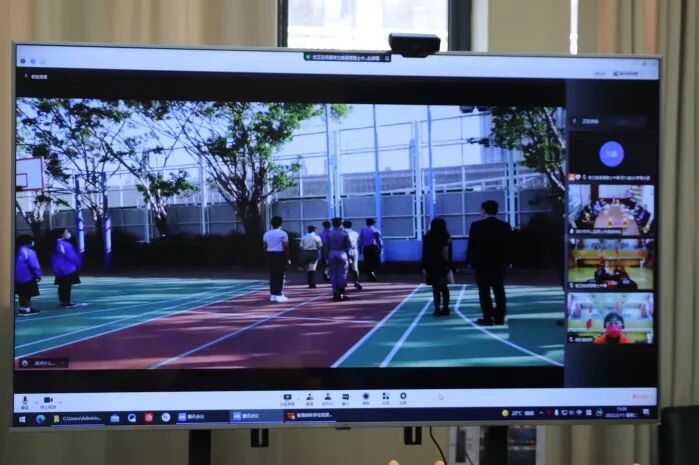 坪山外国语学校领导正在观看姊妹学校的分享视频
