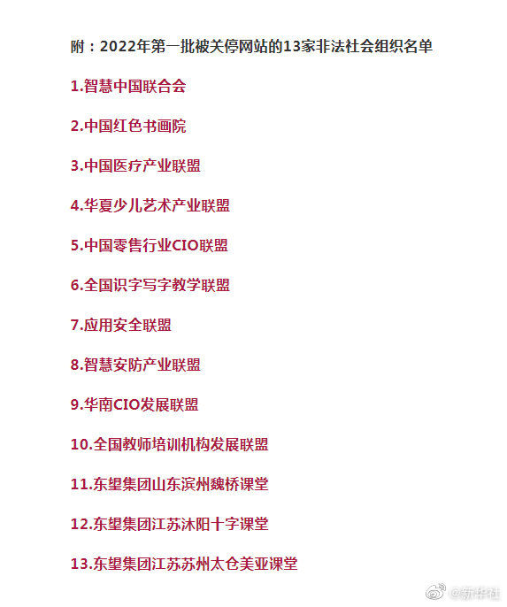 民政部会同有关部门近日依法关停了2022年第一批13家非法社会组织网站及相关新媒体账号,清除了有关关联网页。