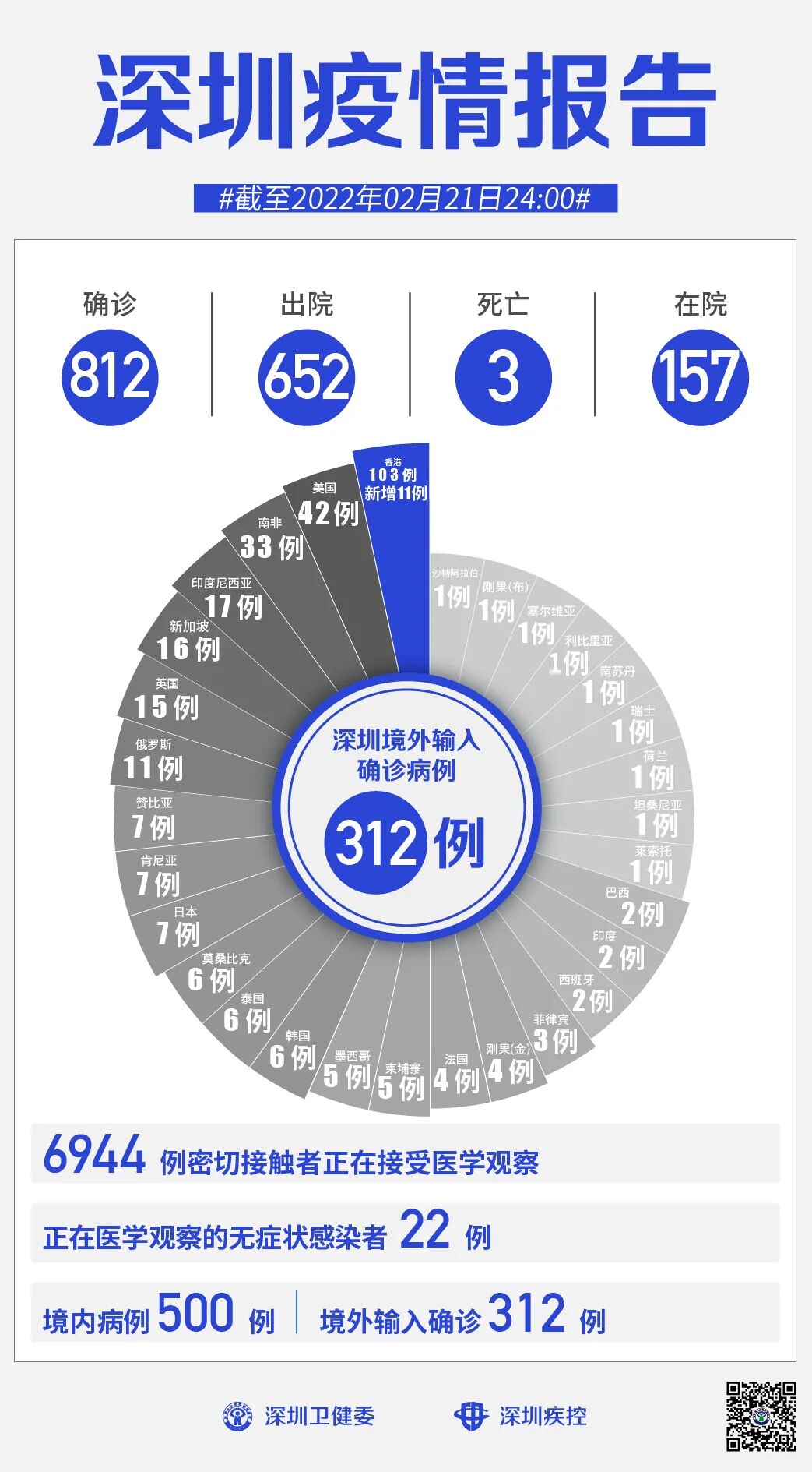 2月21日0-24时,深圳新增3例本土确诊病例,新增11例境外输入确诊病例和5例无症状感染者。