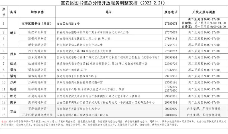 一、新安街道、西乡街道、航城街道、福永街道辖区内分馆有序恢复开放服务,开放时间调整为周二至周日9:00-17:00,阅读中心及服务点参照分馆有序恢复开放,开放时间详见馆外公告;