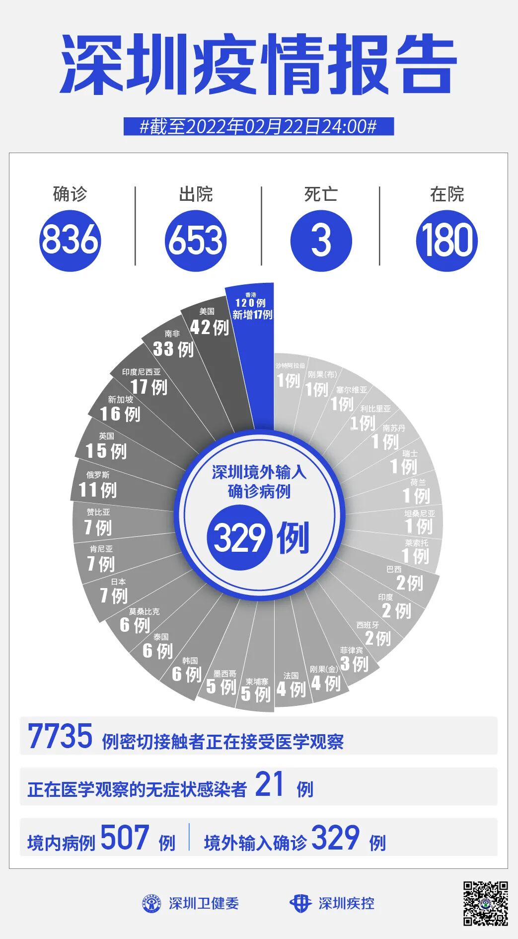 2月22日0-24时,深圳新增7例本土确诊病例和1例新冠病毒无症状感染者,新增17例境外输入确诊病例。