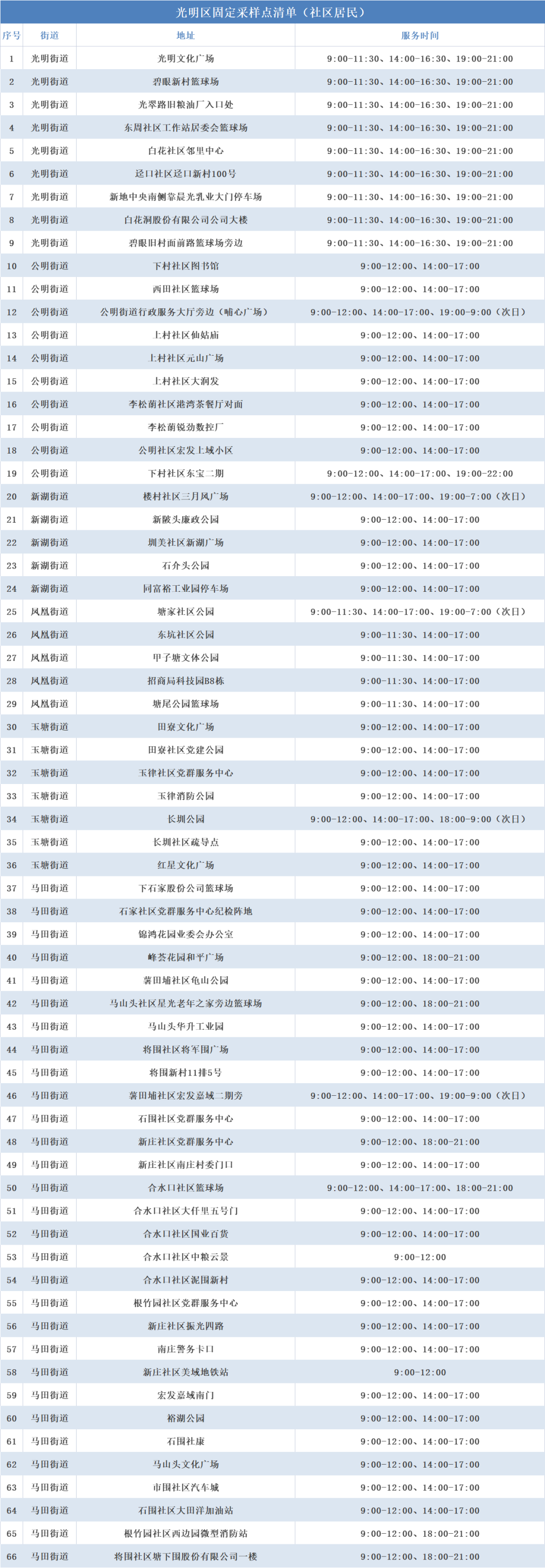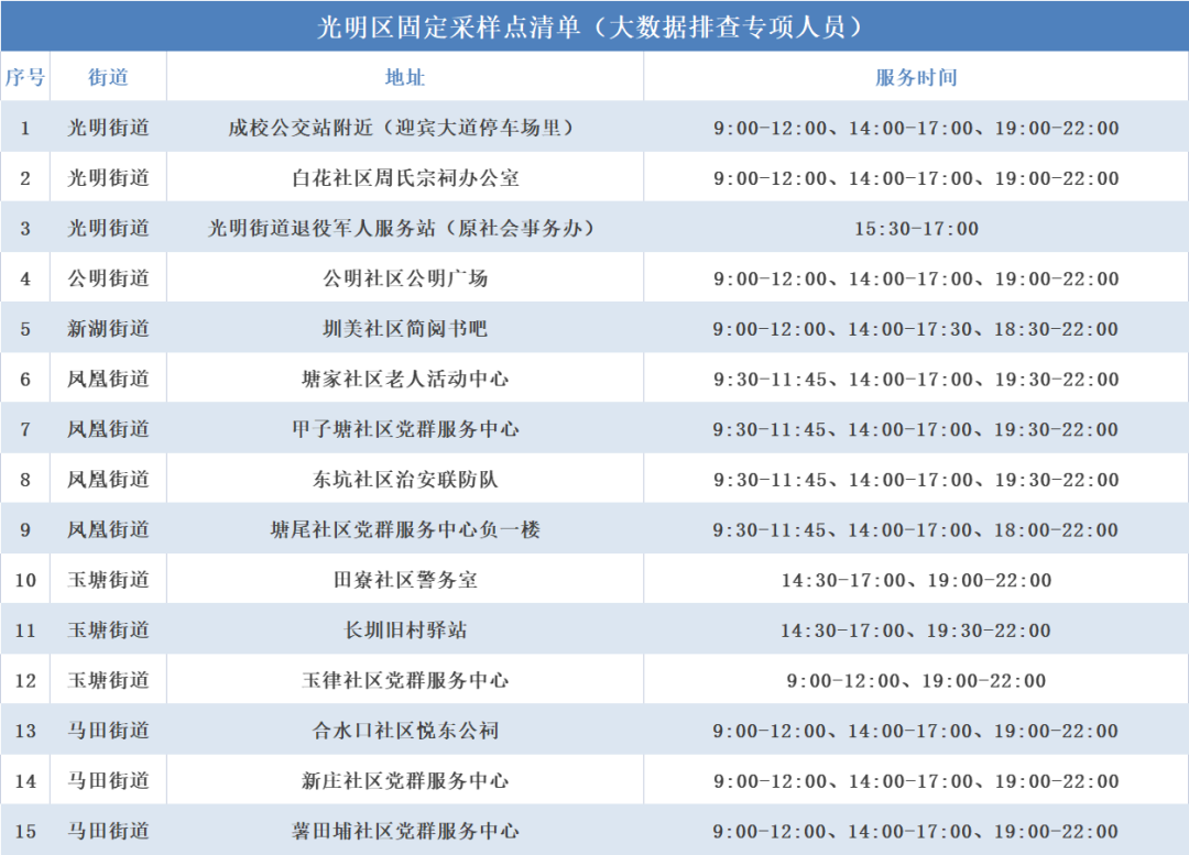 2月23日部分服务点位有调整各位小伙伴看清楚家附近的采样点别跑错啦~光明君提醒您以下固定采样点分为大数据排查专项人员与社区居民采样点注意区分,别跑错点了~部分采样点将提供夜间采样服务有需要的小伙伴可以根据表格上的地点前往~(点击查看大图👇)注意