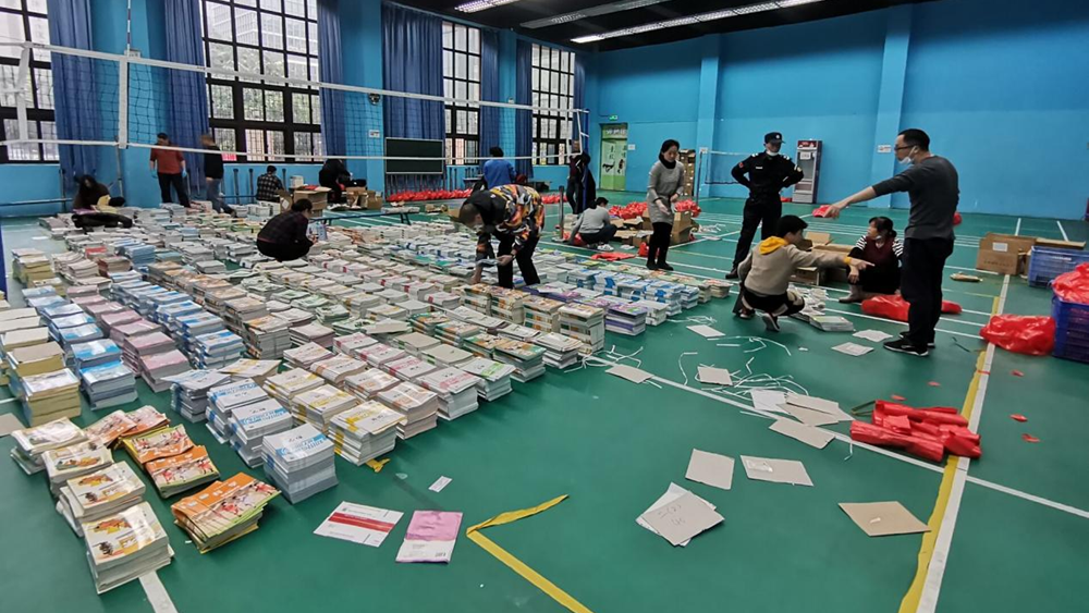 2月20日,福田区景鹏小学的老师们早早来到学校室内体育馆,在6度的气温下为学生们分装书本,并用红色塑料袋包好错峰为学生发放书籍,红塑料袋装着的书本承载着教师的爱,层层包裹的书籍传递着对孩子们的嘱托。