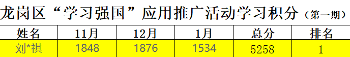 目前,龙岗区“学习强国”应用推广活动持续进行中~第一期活动吸引了1200余人参与挑战刘*祺以3个月总分5258分排名第一获得华为手机大奖