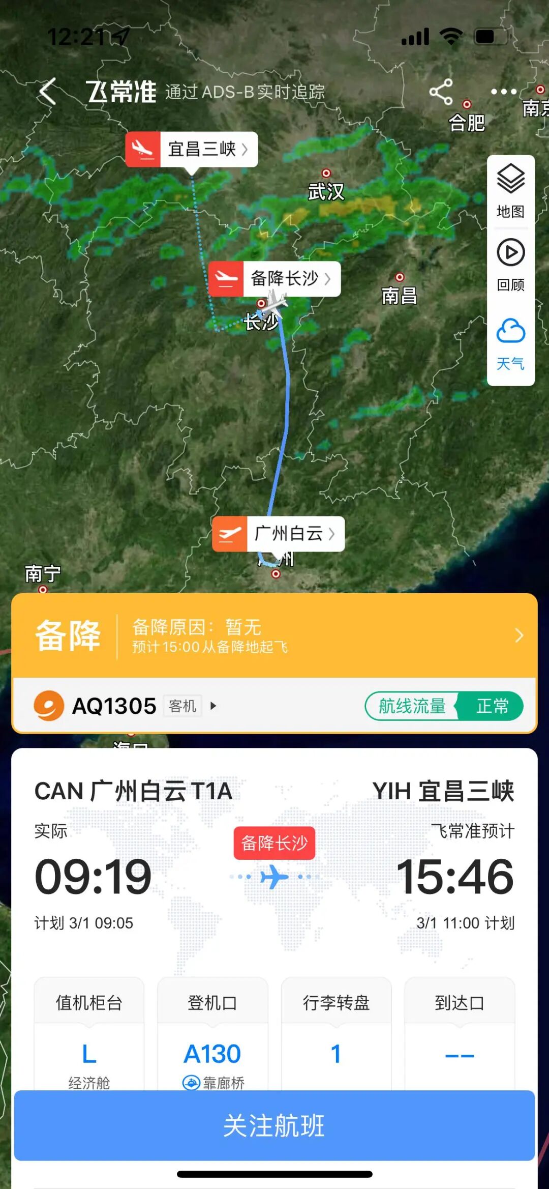 3月1日上午10时许,九元航空AQ1305航班因故临时备降湖南长沙黄花国际机场,这是一架从广州飞往湖北宜昌的波音737客机,航班原定计划9:05分从广州白云机场起飞,计划11:00到达宜昌三峡机场。