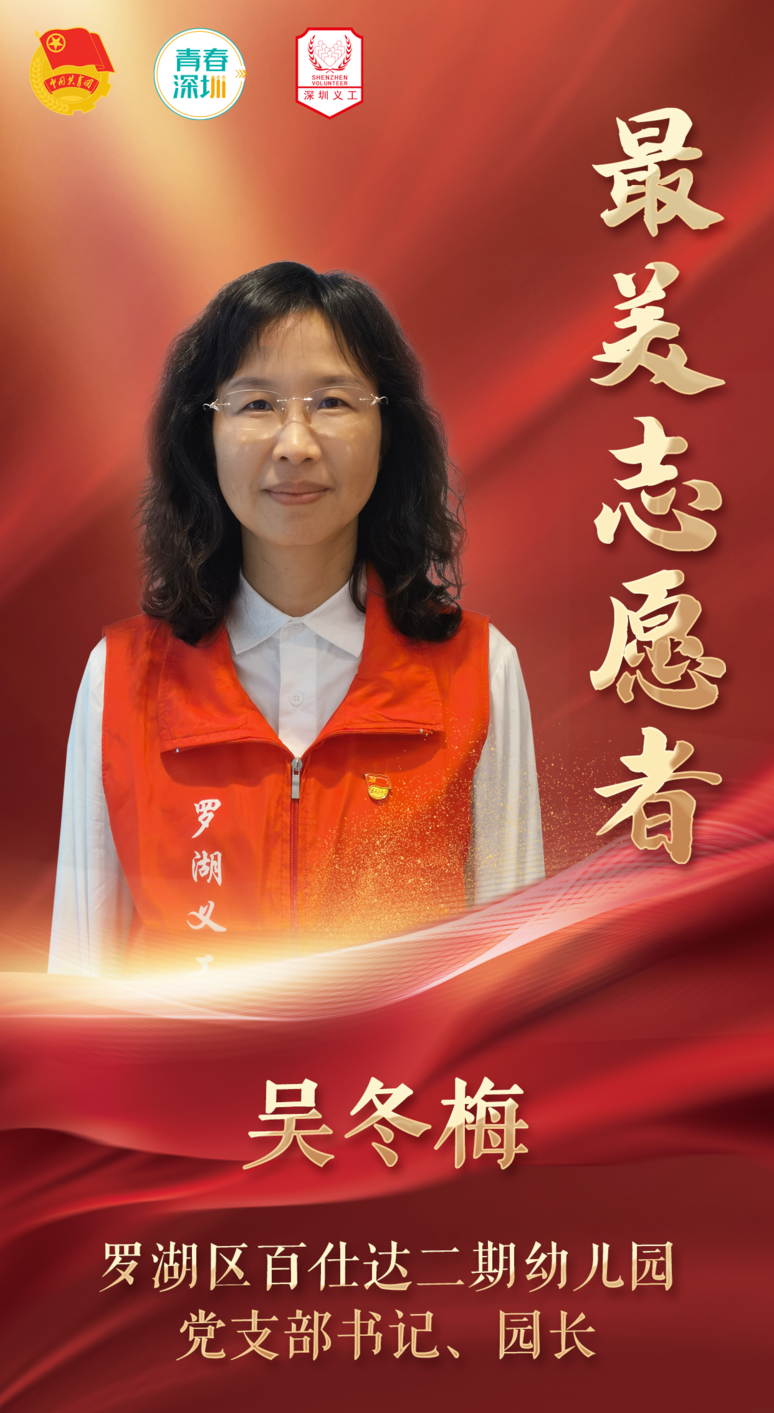 主要事迹:吴冬梅第一时间响应罗湖区教育局号召,在集团内发动教职工,迅速成立40人的志愿者队伍,支援清水河街道的疫情防控工作。吴冬梅率先示范,干在一线。身为小组长,她既要负责对接教育局和街道,统筹协调、合理安排人员,确保各项工作顺利且高效完成,又要密切关注每一位志愿者的身体及工作状况,组织大家交流经验,及时给予人文关怀。此外,她积极参与大数据排查工作,以实际行动展现了无私奉献、敢于担当的良好精神面貌。