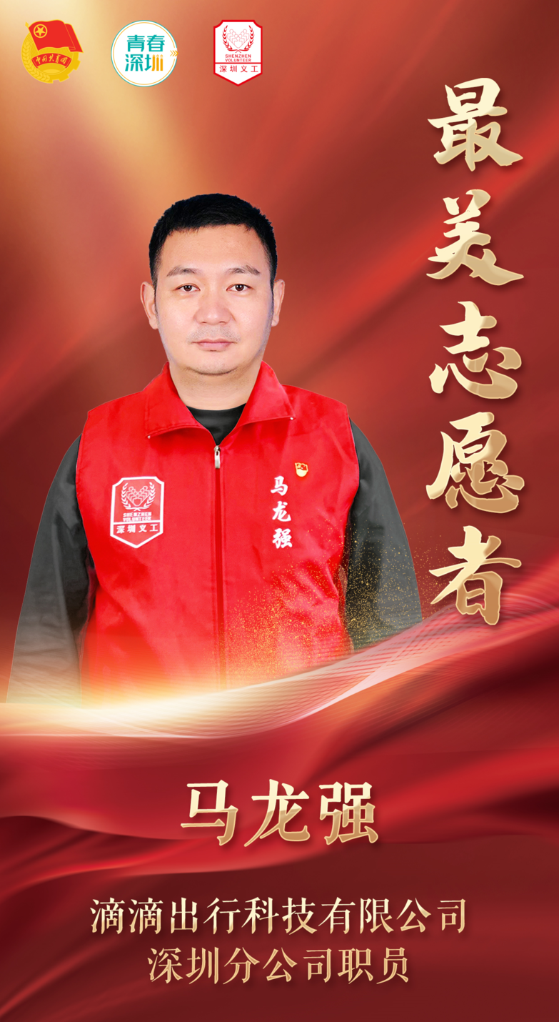 主要事迹:深圳疫情发生后,马龙强同志勇于担当,主动加入滴滴志愿者先锋服务队,组织并参与了香蜜湖街道核酸检测秩序维护、共享单车防疫消杀、宝安机场网约车司机防疫宣讲和物资发放等志愿服务。在马龙强同志的组织带动下,团队累计发放口罩、消毒液等防疫物资45620套,消杀网约车车辆5208台,带动130余人次的网约车司机和公司员工参与志愿服务活动,得到市民群众的广泛好评。