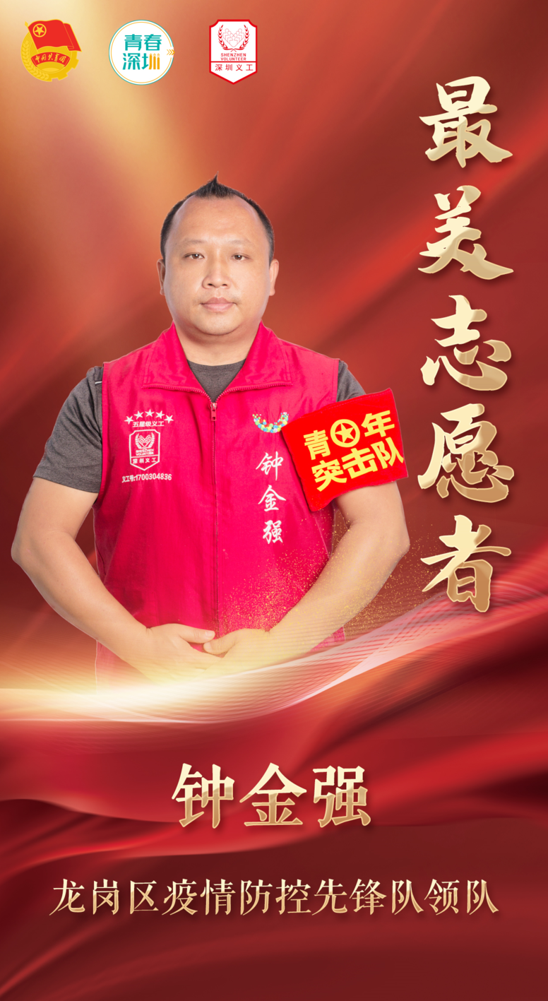 主要事迹:1月7日深圳疫情发生后,作为龙岗区疫情防控先锋队领队,钟金强第一时间响应组织号召来到封控区,协助区志联开展疫情防控志愿者岗前培训、岗位分配,并进入防控区现场辅助医务人员开展核酸检测信息填写和录入、引导市民有序排队等工作。此外,他积极开展为封控管控区居民配送爱心餐、生活物资等工作,接听居民防疫热线,及时跟进居民反馈需求,对鼓励封控管控区居民进行心理疏导。
