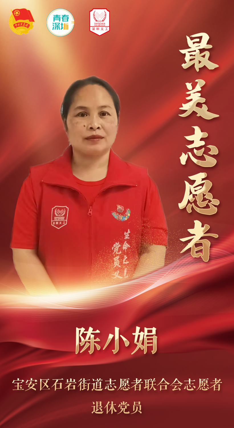 主要事迹:深圳疫情发生以来,陈小娟作为共产党员,积极参与星城核酸采样点志愿服务,负责志愿服务统筹工作,协调安排志愿者服务班次,保障志愿服务有条不紊地进行。2021年以来,她先后在石岩街道志愿者联合会、深圳北站社区党群服务中心、深圳市地铁志愿者联合会等多个部门参与志愿服务工作,累计服务时长超过1000小时。