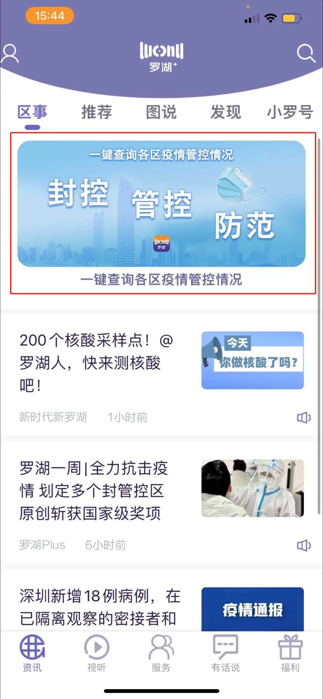 日前,“深圳市疫情封控、管控防范区域一键查询”地图正式上线。罗湖居民可以通过“新时代新罗湖”微信的菜单栏“微服务”-“抗疫地图”,以及“罗湖Plus”APP首页的“一键查询各区疫情管控情况”页面进行查看。