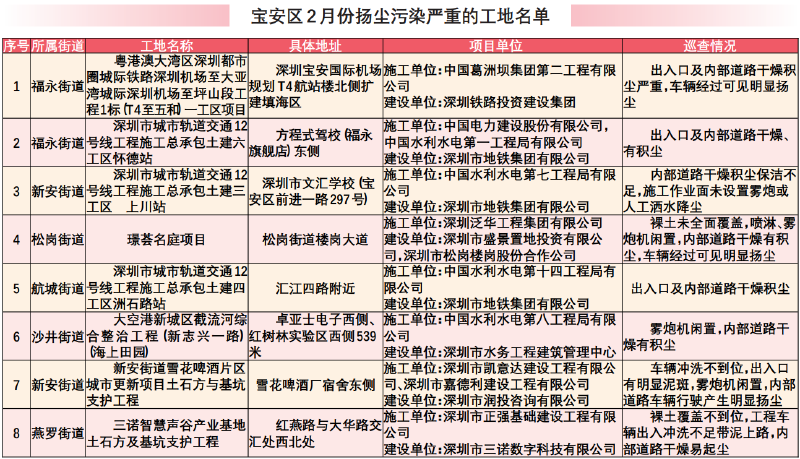 宝安区2月份扬尘污染严重工地名单公开曝光。