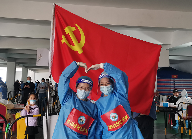 两位钟丽老师主动向社区申请安排到扫码员的岗位,她们身着防护服,熟练地核对采样管条码、细心地录入每一位居民的检测信息,一站数小时,并肩作战。