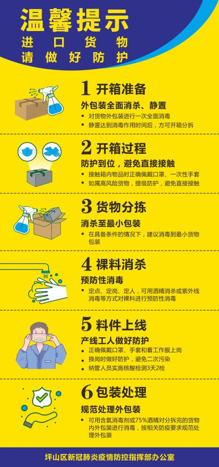 为严格落实深圳市日前出台的《境外输入物品疫情防控工作指引(第二版)》,坪山区根据辖区实际情况,出台《坪山区境外输入物品疫情防控工作专班工作方案》。方案明确相关部门职责分工,加强督促检查,做好境外输入物品的通关、运输、装卸、贮存、加工及销售等各环节的新冠病毒防控工作,并持续深入走访企业,加强督导,以暖心举措助力企业安全生产。