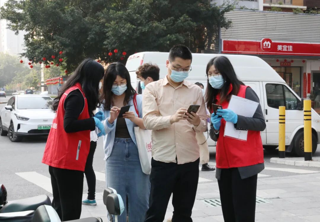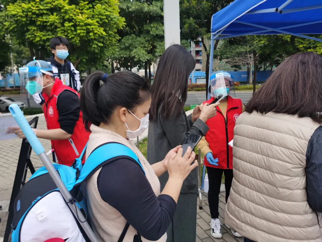 银盛志愿服务队利用下班后的休息时间,分两批来到龙塘社区简上公园核酸检测点和龙塘村篮球场核酸检测点开展志愿服务活动,引导大家按要求扫码,耐心地解答群众的咨询,担当牢记在心,不遗余力地支援疫情防控工作。