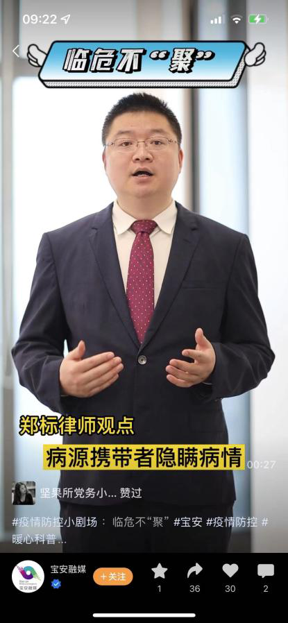 “齐心抗击疫情,避踩法律红线。”宝安律师党委在宝安融媒平台以多种形式释法,做老百姓看得懂、愿意看的防疫普法短视频,引导居民提高防疫意识、积极参与全民抗疫,为抗击疫情提供法治保障。