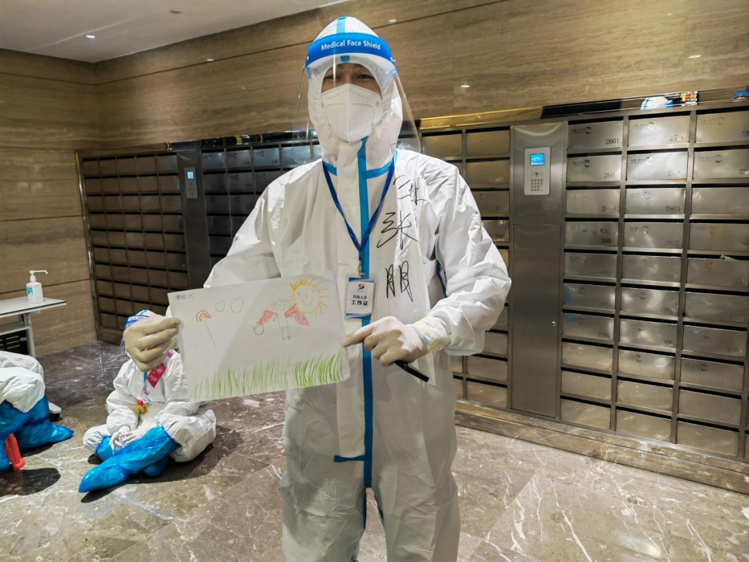 在一次上门核酸检测时,一位小女孩在母亲背后探出头说:“谢谢哥哥姐姐们,你们辛苦了!”并举起手中画,想要送给这些“大白”。