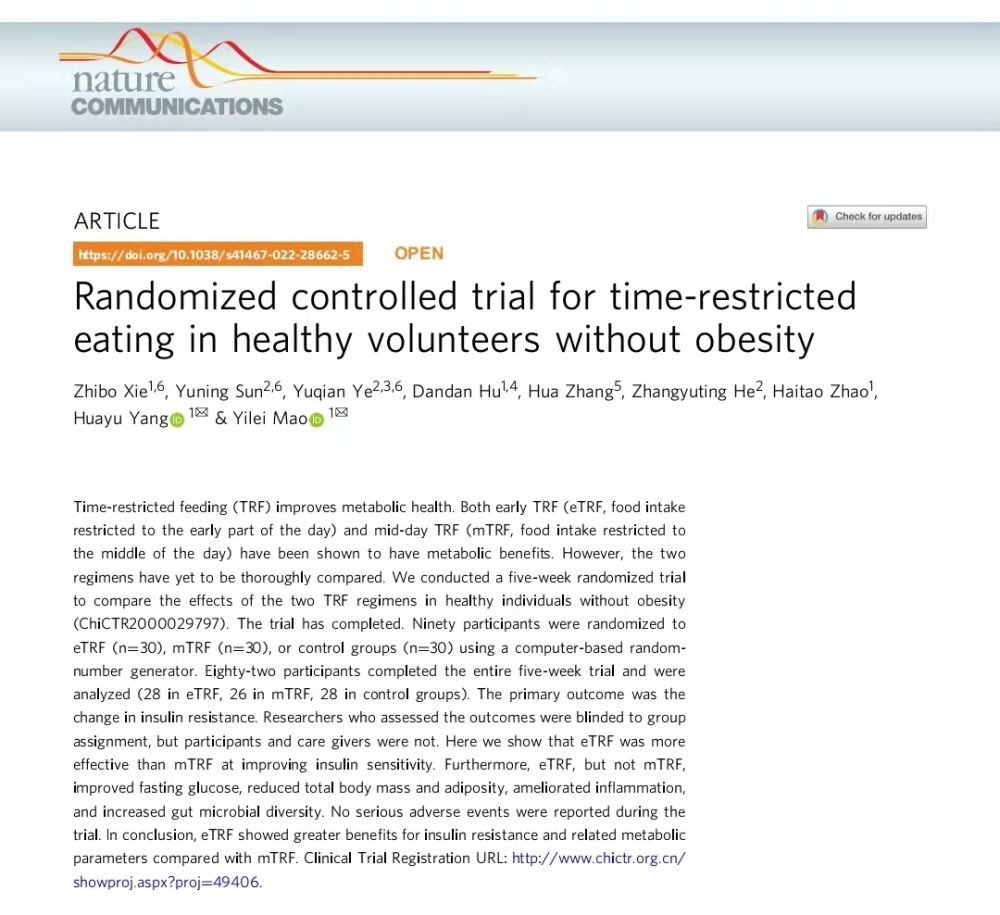 毛一雷、杨华瑜团队发表的题为《不肥胖健康志愿者限时进食的随机对照试验》的研究论文截图