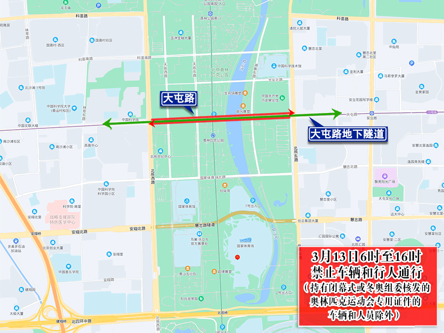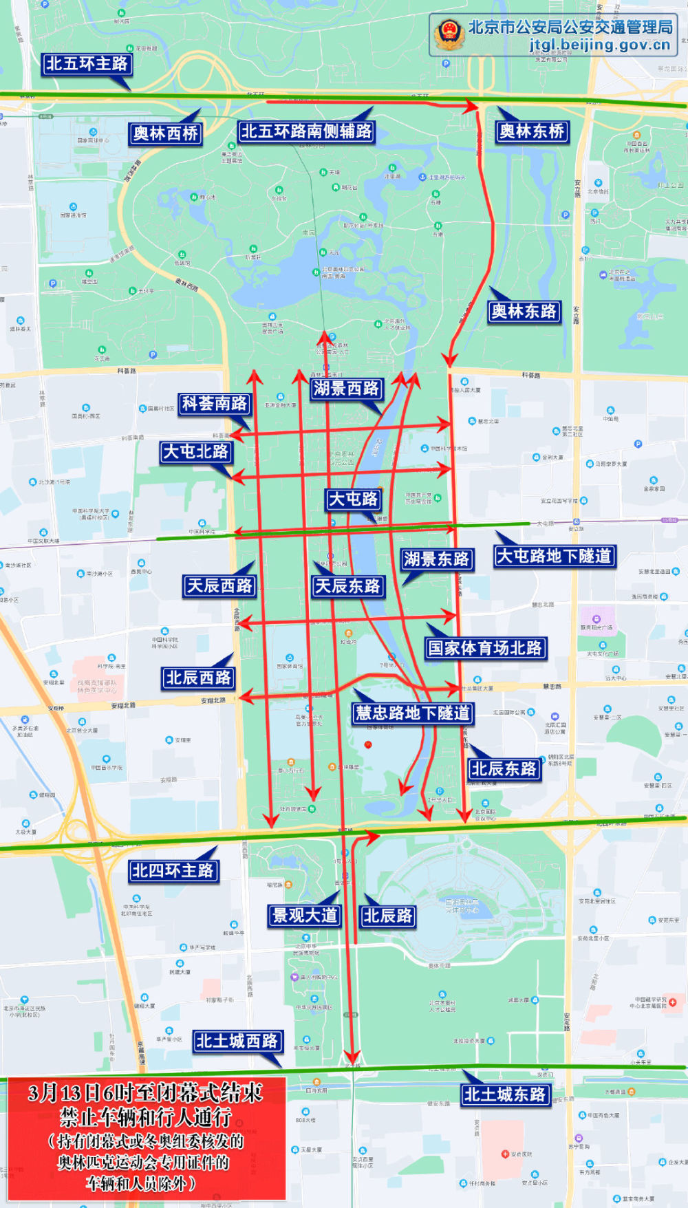 6时至闭幕式结束,慧忠路地下隧道、国家体育场北路、大屯北路、科荟南路、北五环路南侧辅路(奥林西桥至奥林东桥)、天辰西路、景观大道、天辰东路、湖景西路、湖景东路、奥林东路北向南方向主辅路、北辰东路北向南方向主辅路、北辰路南向北方向主辅路(民族园路至北辰桥),除持有闭幕式或冬奥组委核发的奥林匹克运动会专用证件的车辆和人员外,禁止其他车辆和行人通行。社会车辆和公交车可经大屯路地下隧道、北四环路、北五环路主路及北侧辅路、北土城西路、北土城东路绕行。