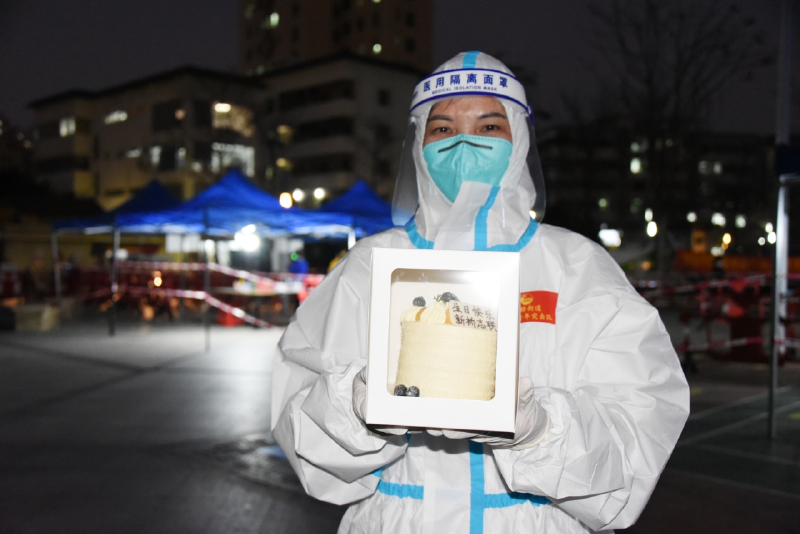 3月11日晚上7点,志愿者梁三妹正准备继续到新桥街道上星社区向西公园核酸检测采样点服务,突然看到新桥街道志愿者联合会负责人出现在她面前,并送上生日蛋糕和祝福。这一暖心之举,梁三妹感到既惊喜又感动。