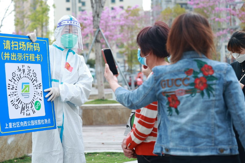 在各个核酸检测采样点,这些志愿者们在防护服上写下的“新桥街道抗疫青年突击队”字样特别显眼。他们在现场引导居民群众戴好口罩,保持安全距离,有序排队采样,并安排老弱病残孕等特殊群体走绿色通道。他们一遍遍重复同样的话,不厌其烦地讲解采样流程和防疫政策。他们中,不仅有“夫妻档”“父女兵”“兄弟团”等志愿者组合,还有教师、白领、宝妈、外卖小哥等来自各行各业的、不同年龄段的志愿者。