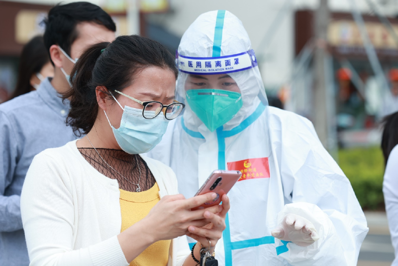 志愿者引导市民扫码后排队进行核酸检测采样。