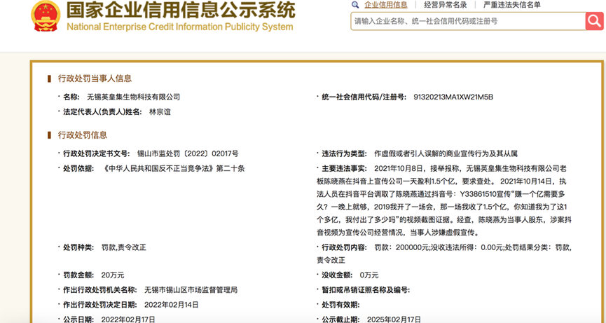 然而,经网友举报,无锡市锡山区市场监督管理局调查发现,涉案抖音视频为宣传公司经营情况,当事人陈某因涉嫌虚假宣传,监管局作出罚款20万元并被责令改正的处罚决定。