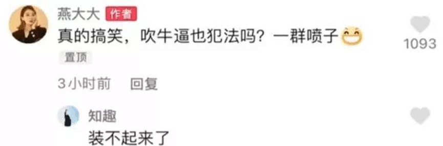吹牛视频在网络发酵后,“燕大大”账号转为了私密状态,并发声明表示:“请大家不要带节奏了,已经起诉污蔑我的博主,我们学会要用法律保护自己,后续我会上传相关纳税证明以及起诉书。”同时还称:“真的搞笑,吹牛也犯法吗?”