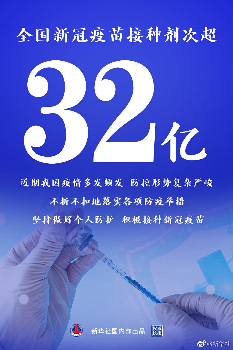 国家卫健委3月16日通报,全国新冠疫苗接种剂次超32亿。近期我国疫情多发频发,防控形势复杂严峻。坚持“外防输入、内防反弹”总策略、“动态清零”总方针不动摇、不放松。不折不扣地落实各项防疫举措,尽快遏制疫情扩散势头。坚持做好个人防护,积极接种新冠疫苗。