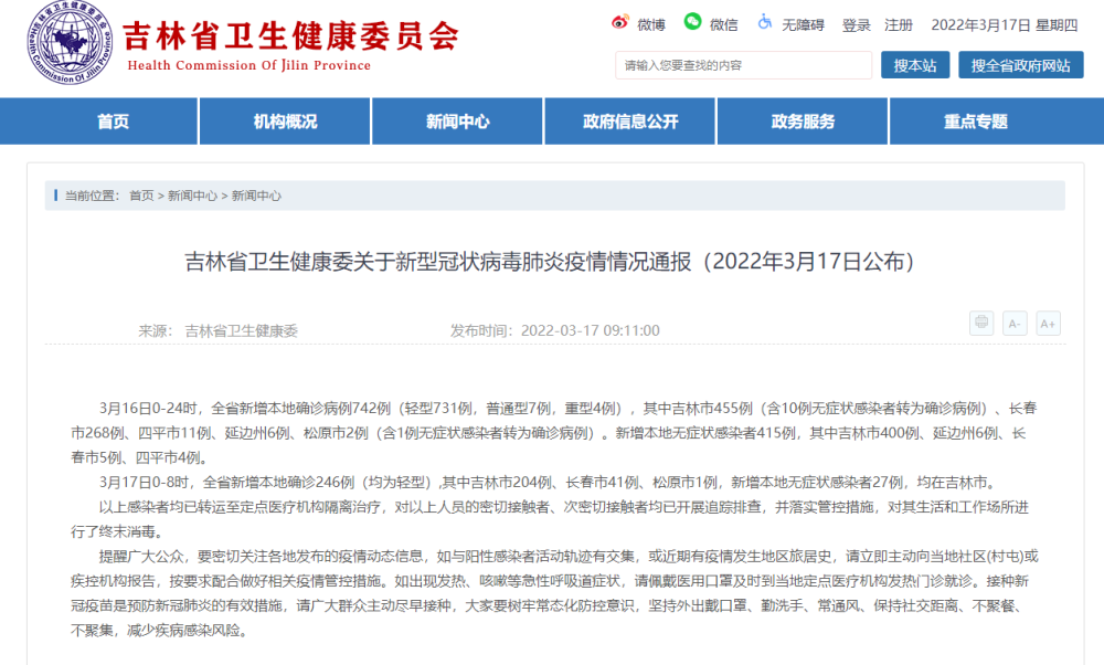 3月16日0-24时,全省新增本地确诊病例742例(轻型731例,普通型7例,重型4例),其中吉林市455例(含10例无症状感染者转为确诊病例)、长春市268例、四平市11例、延边州6例、松原市2例(含1例无症状感染者转为确诊病例)。新增本地无症状感染者415例,其中吉林市400例、延边州6例、长春市5例、四平市4例。